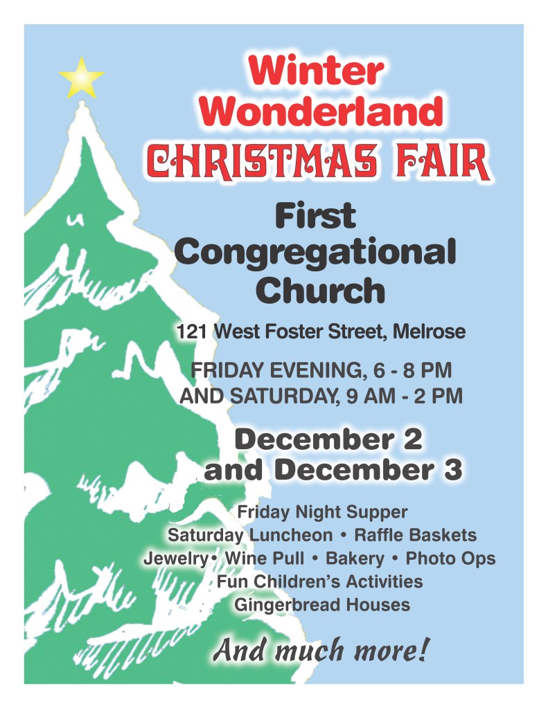 This year during Home for the Holidays, First Congregational Church in Melrose is thrilled to invite you to the return of our Winter Wonderland Fair! There will be activities both inside and out for all to enjoy. Shop for children’s toys and books & all kinds of Christmas items and collectibles, roast some s’mores, take part in decorating gingerbread houses, have a family photo or video greeting taken, participate in one of our many raffles or our “Wine Pull,” and much more! First Congregational Church in Melrose, United Church of Christ, 121 West Foster Street. Just one block west of Main Street! Friday evening 6 – 8pm, Saturday 9am – 2pm. Visit our website at fccmelrose.org