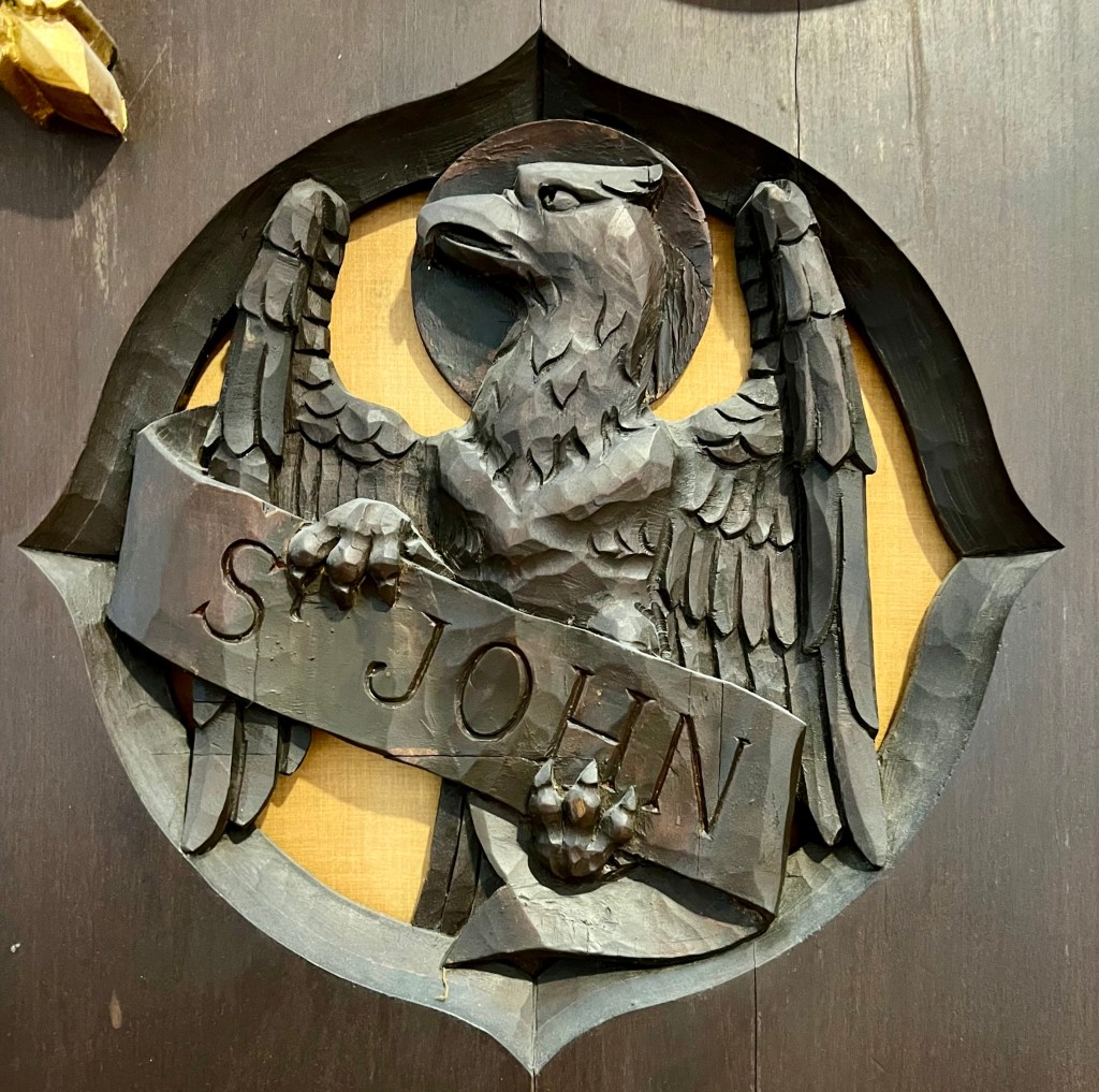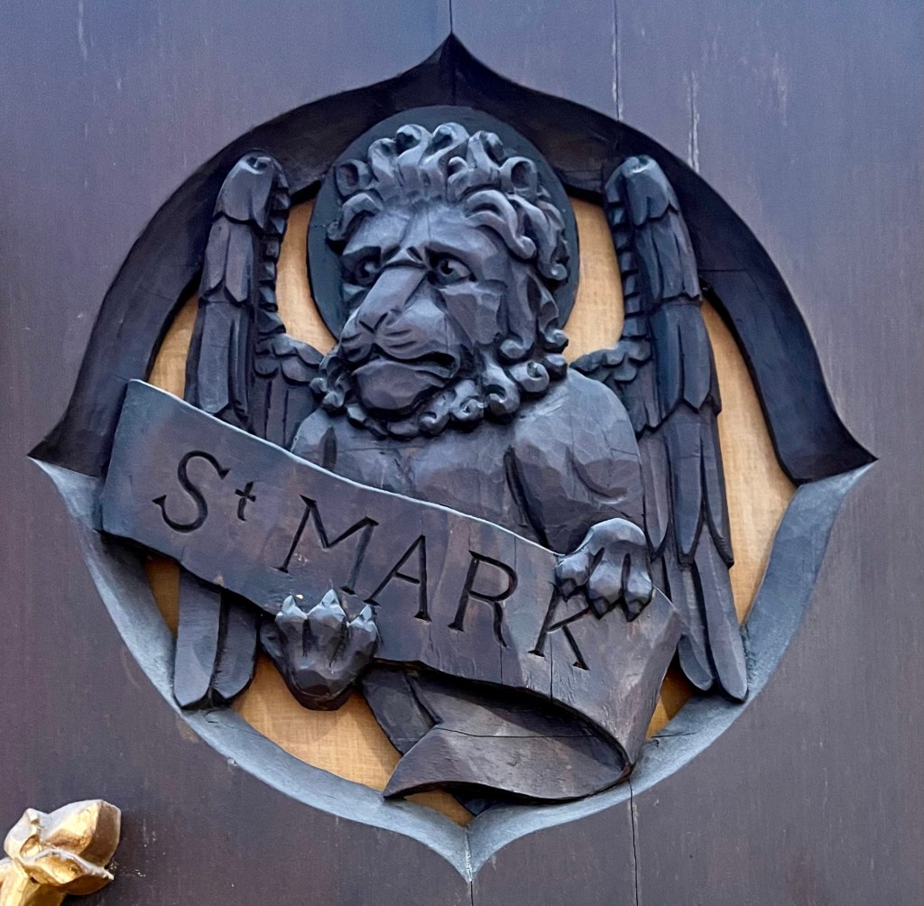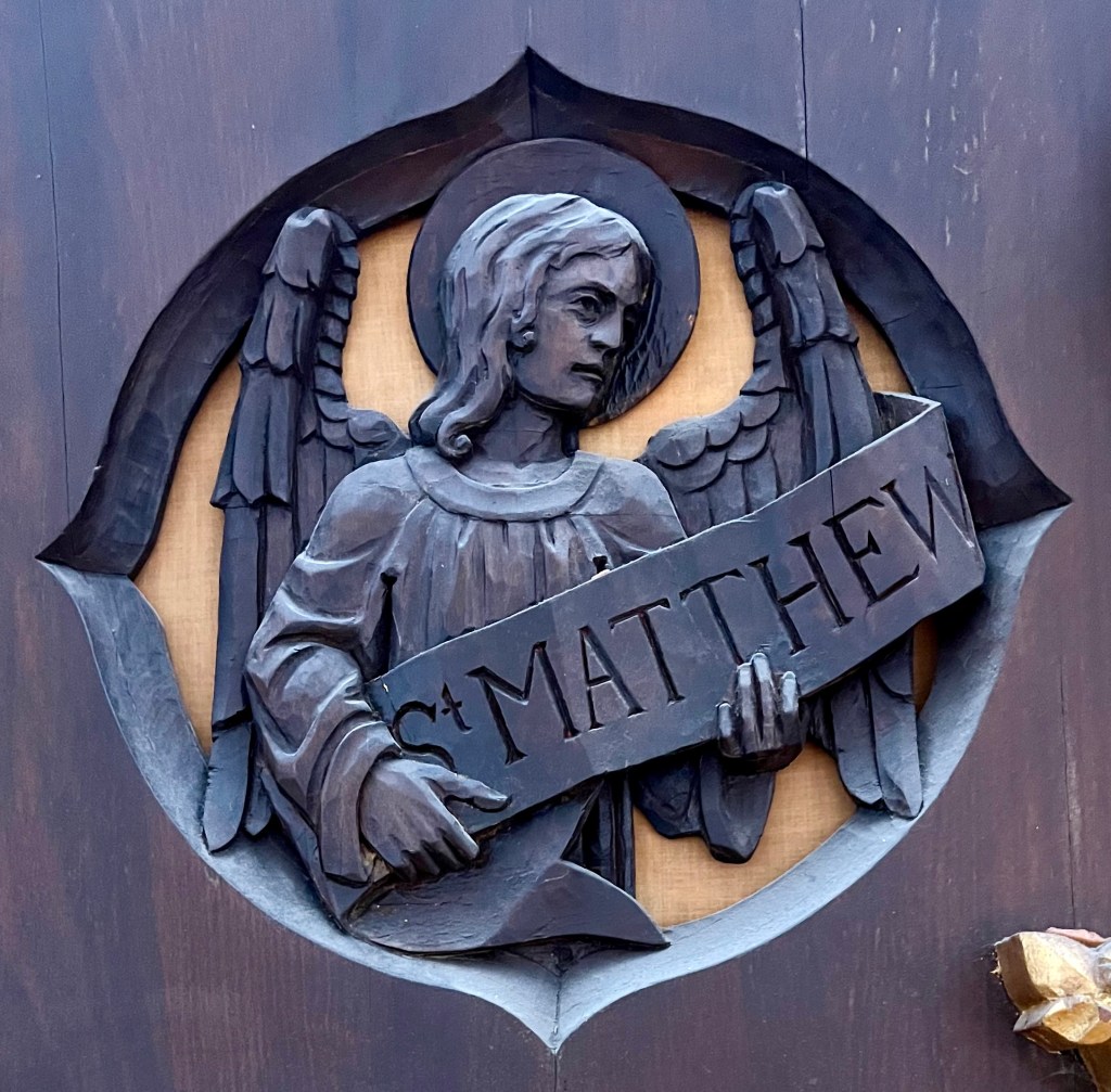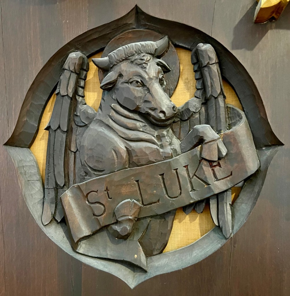 Each of the Gospel writers, also known as the Four Evangelists – Matthew, Mark, Luke, and John – are displayed in the four corners of the cross. Known as a tetramorph, the four-winged creatures of the tetramorph also represent the four facets of Christ. Matthew is symbolized as a man because his gospel narrative begins with a genealogy; Mark as a lion (or king), roaring in the desert with prophetic power; Luke as an ox, the lowly servant; and John as an eagle, flying heavenward like the divine Word.