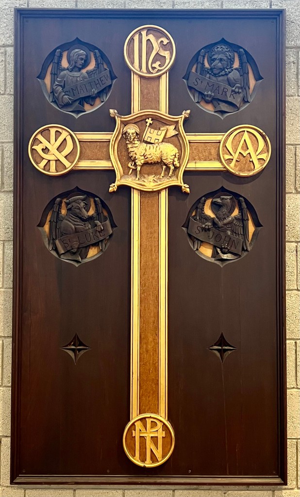 The focal point of the screen is the cross; it reminds us that we are saved from a life of sin to a life more abundant through Christ. There are more than four hundred known forms of crosses and more than fifty are used in Christian symbolism. At the center of this cross is the Agnus Dei, or symbol of the “Lamb of God” carrying the banner of victory.